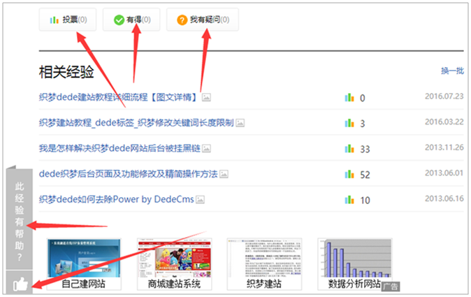 7、相关文章推荐设置。在当前经验文章的下面,百度使用了“相关经验”推送相关文章,一方面加强当前页面的相关性,另外一方面吸引用户继续阅读,增加了浏览者浏览当前页面的停留时间以及访问深度,提升用户体验。